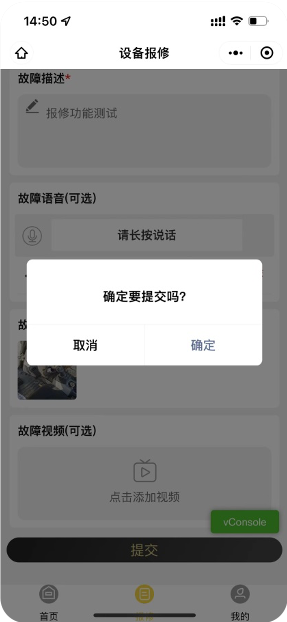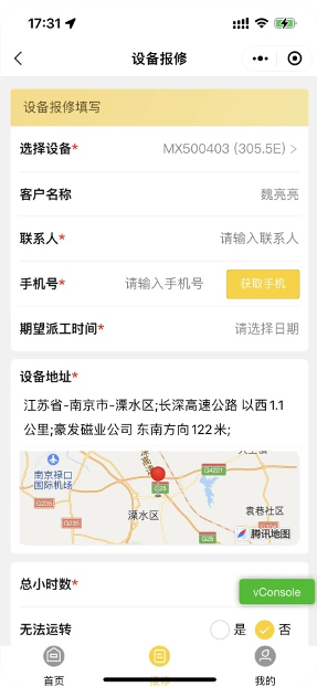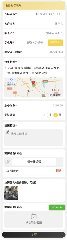 在报修页面填写报修详细信息,然后提交。* 这里会自动带入上一步选中的设备信息