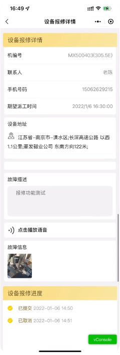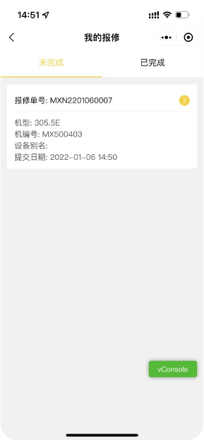用户查看报修中和已完成报修的设备;点击一条报修记录可查看详情;