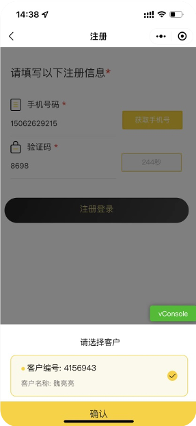 (以客户代码为例)页面显示查询到的客户编号和客户名称,确认无误后点击“确认”;
